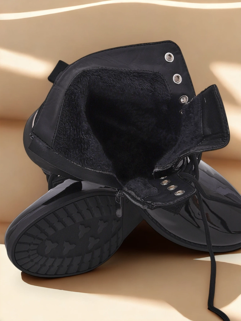 - з шнурівкою. Стильні чоботи з екологічної шкіри. Взуття на шнурівці. Модель має плоску підошву та хутрову підкладку. Ідеально підходить для осені!