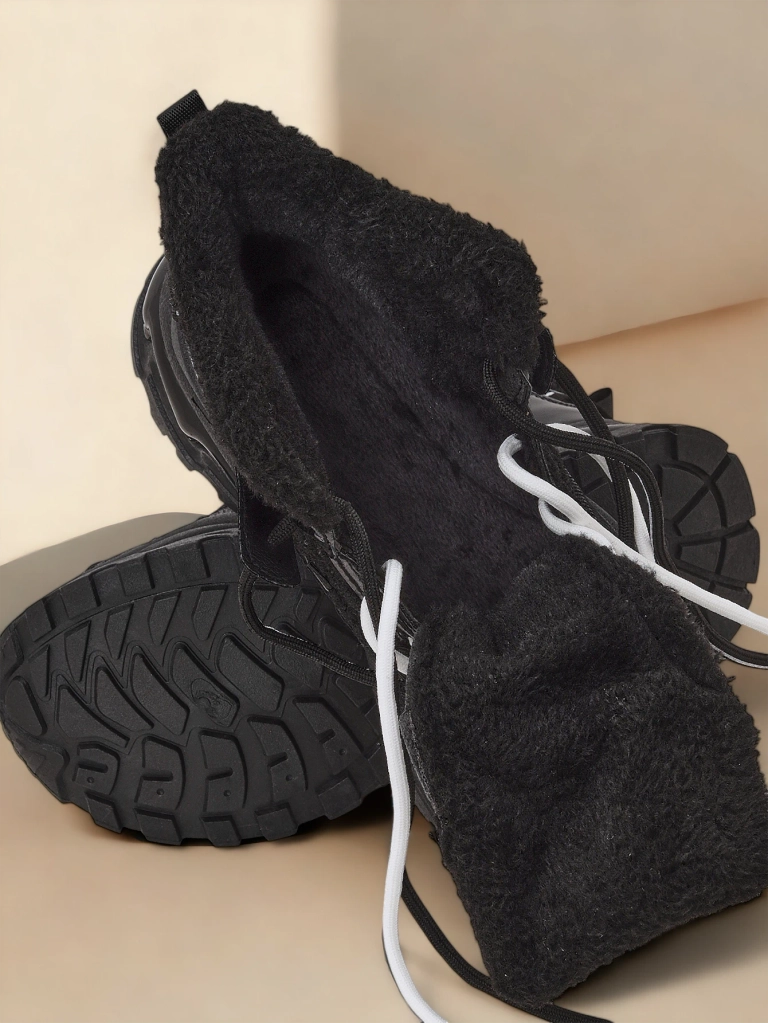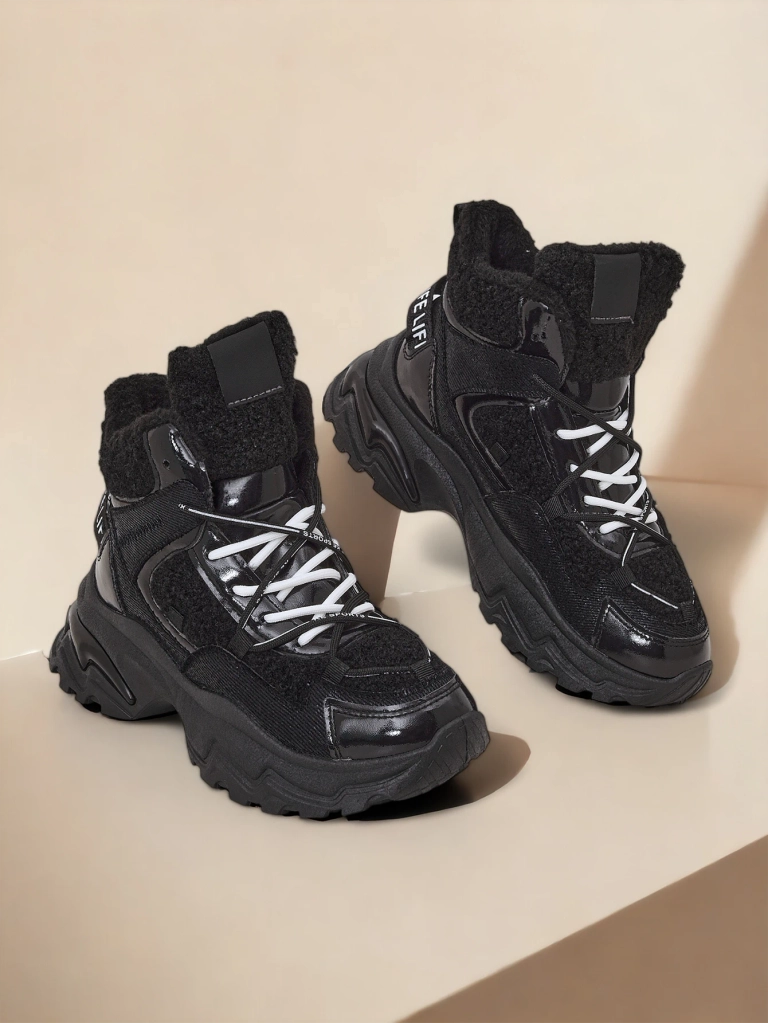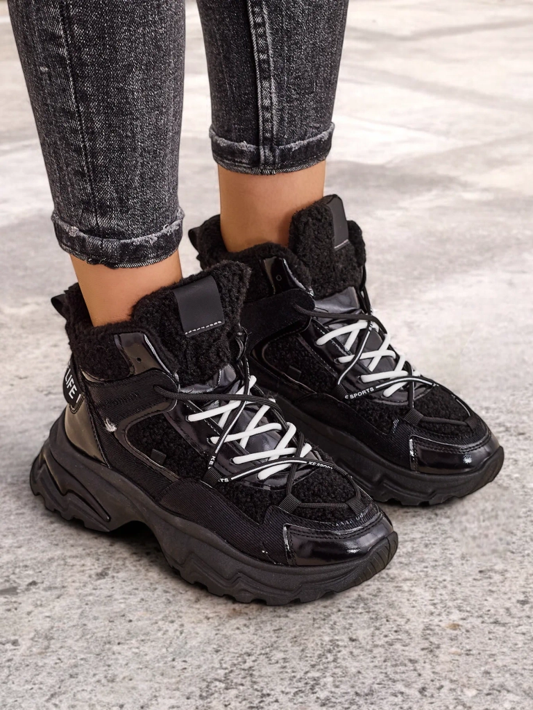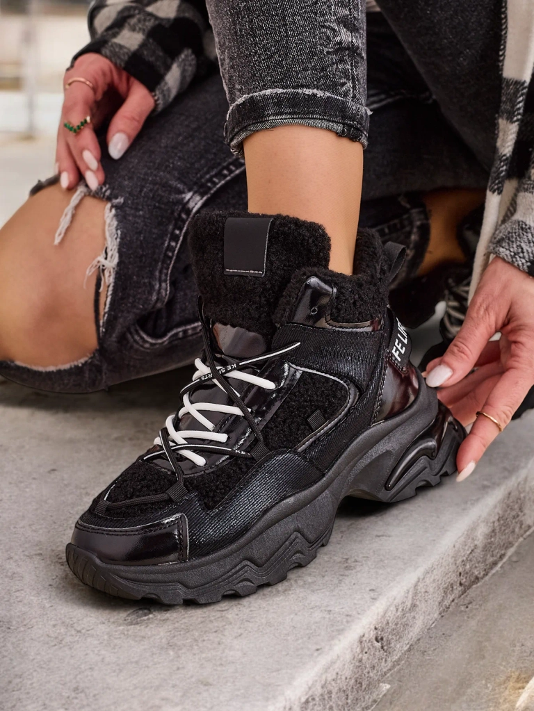 - Жіноче утеплене спортивне взуття в стилі кросівок на товстій підошві. Верхня частина на шнурівці з комбінації лакованої шкіри та тканини. Всередині м'яке хутро. Відмінна доповнення до вашого зимового повсякденного гардеробу!