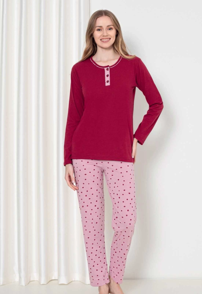 - Жіночий комплект піжами з 2 предметів з довгими рукавами та довгими штанами, виготовлений з бавовняного матеріалу. Модель прикрашена принтом. Ідеально підходить для затишних вечорів вдома! ЗАУВАЖЕННЯ: Точність вимірювань (+/-) 1 см.