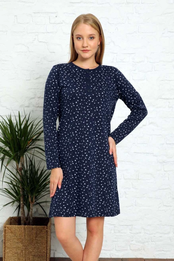 - Жіноча нічна сорочка виготовлена зі 100% м'якої бавовни. Модель має трохи розширений крій. Вона має круглий виріз, довгі рукави та декоративний принт. УВАГА: Точність вимірювання (+/-) 1 см.