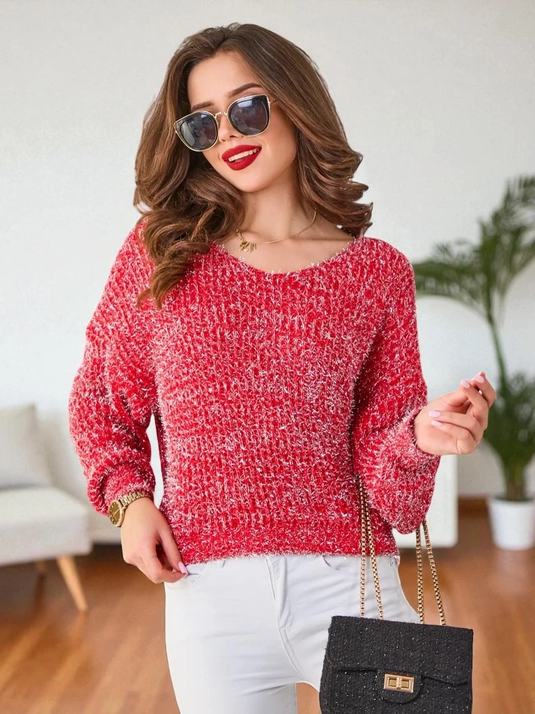 - Цей стильний светр втілює в собі комфорт і шарм. Зроблений з м’якого матеріалу, светр має V-подібний виріз і довгі рукави. Вільний крій і блискуча нитка надають йому унікального шарму!