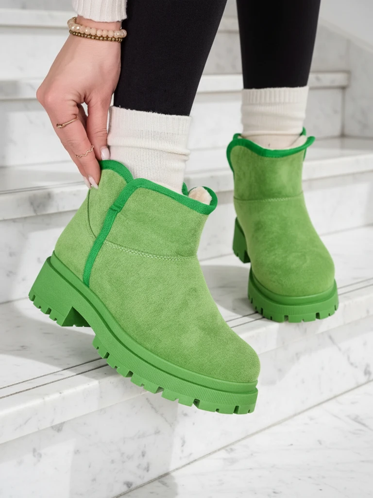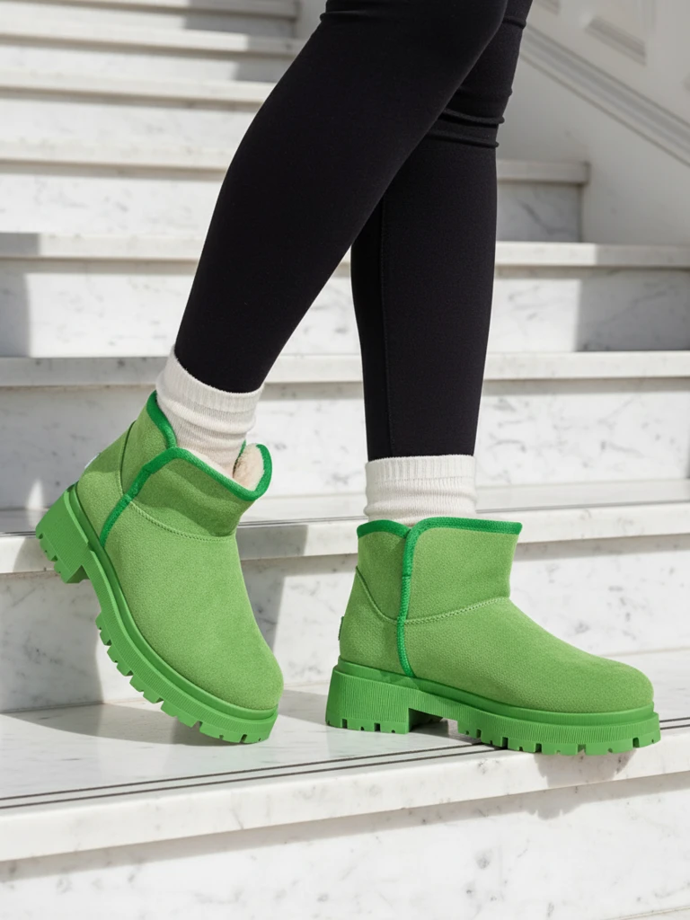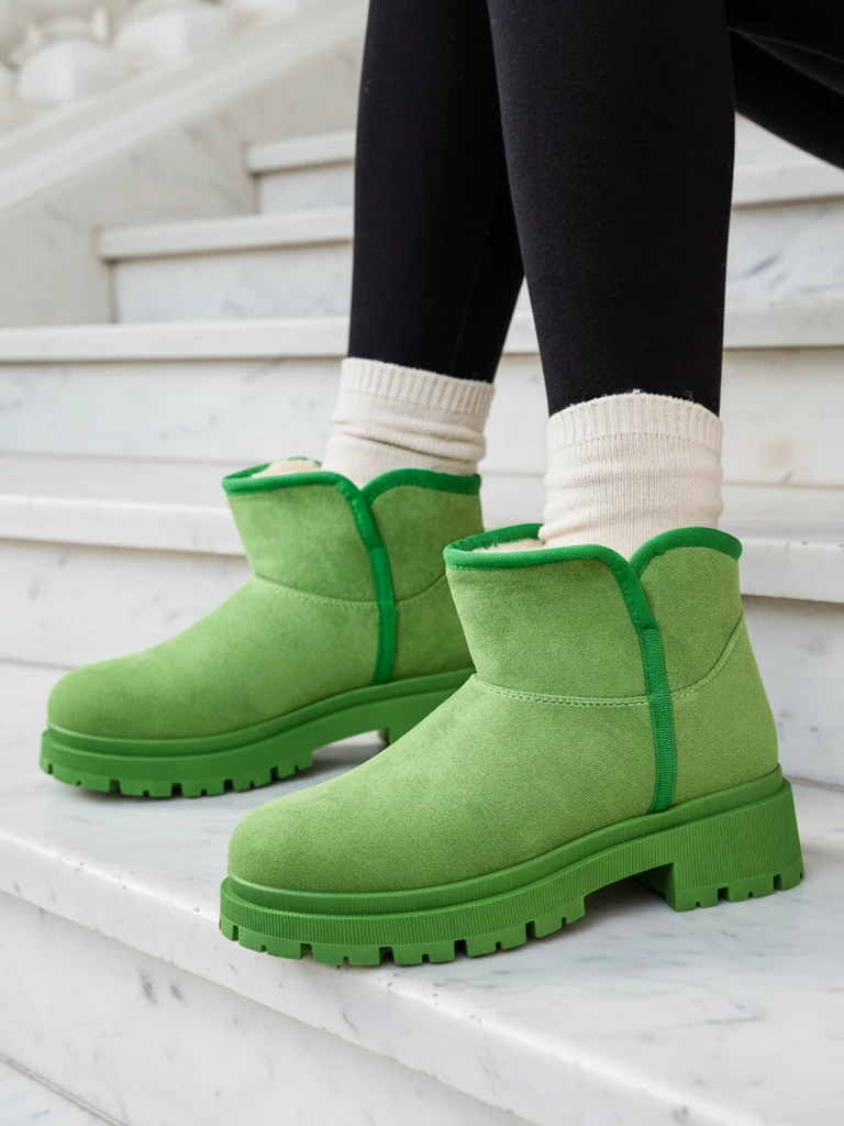 - Чудові зимові снігові черевики для жінок на плоскій підошві. Верх виконаний з штучної замші, а внутрішня частина підкладена хутром для додаткового тепла. Ідеальна основа для зими!