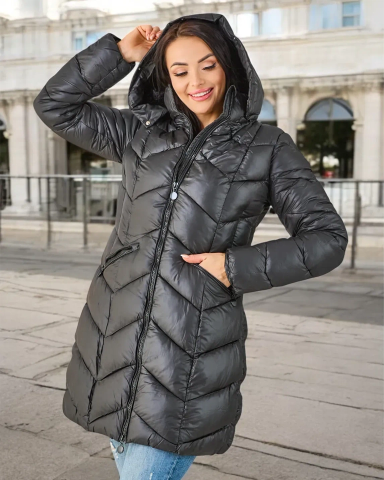 - Тепла жіноча зимова куртка до колін з відстібним капюшоном. Стегновий модель, має 2 кишені на застібці-блискавці та застібку на блискавці. Внутрішня підкладка взуття оброблена хутром і має синтетичне теплоізоляційне наповнення. Ідеально підходить для прох