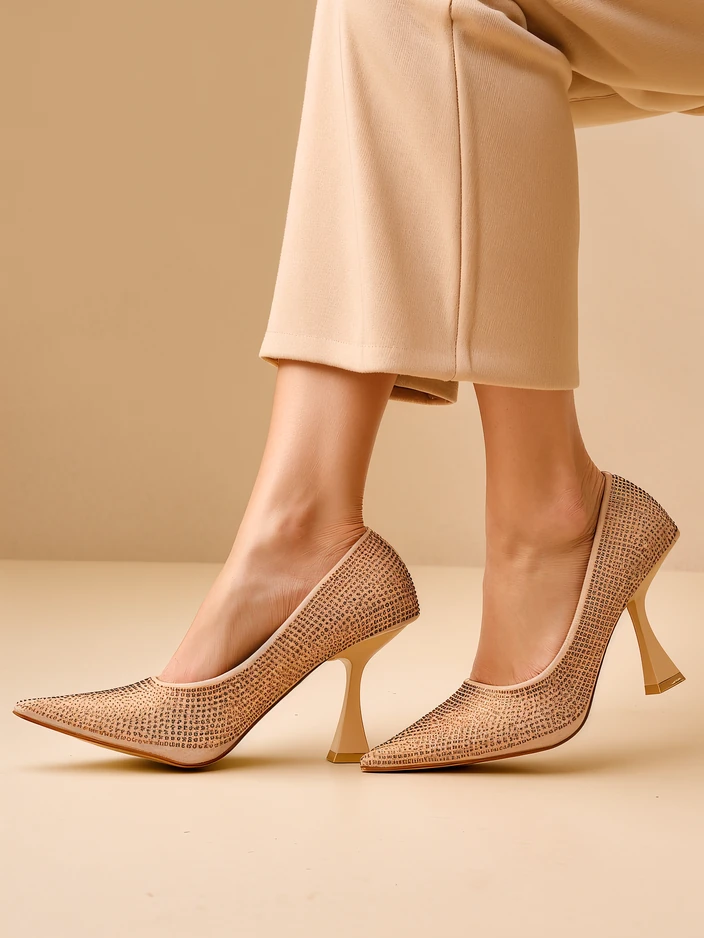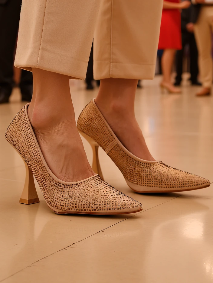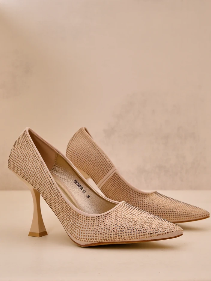 - Елегантні жіночі туфлі на шпильках, виготовлені з тканини, покритої стразами. Внутрішня частина взуття оббита екологічною шкірою, а гострий носок візуально подовжує ноги.