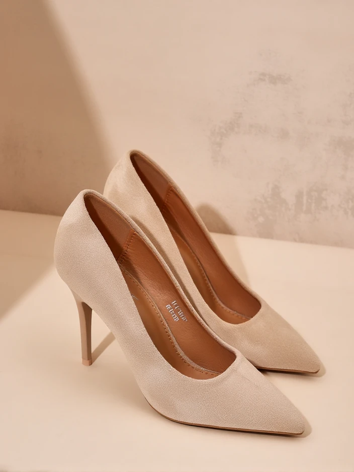 - Елегантні жіночі туфлі на високих підборах, виготовлені з еко-замшевої шкіри. Внутрішня частина взуття оброблена еко-шкірою. Загострений носок додає елегантності!