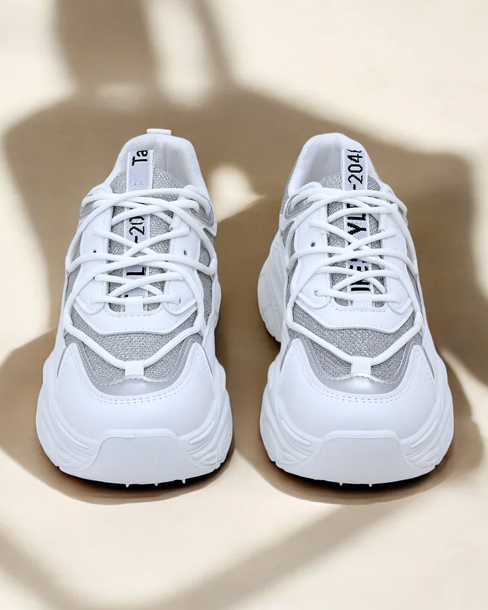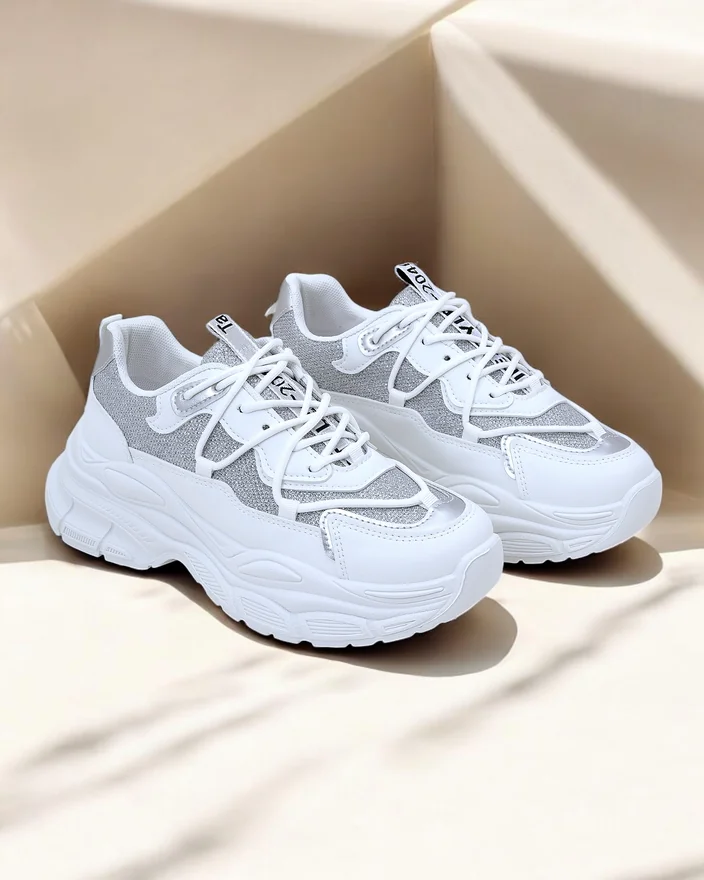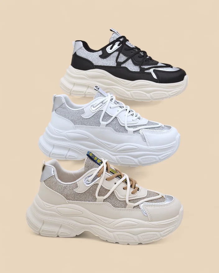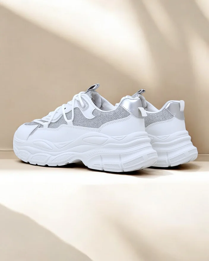 - Жіночі спортивні черевики у формі кросівок на товстій підошві. Зроблені з еко-шкіри з блискучими вставками. Тканинна устілка. Чудовий додаток до ваших повсякденних casual образів!