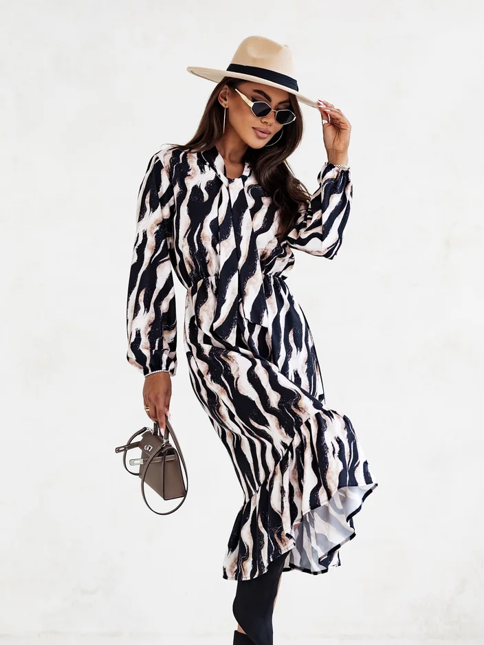 - Жіноча міді сукня з принтом, довгими рукавами та зав'язкою на шиї. Модель має еластичний пояс і вільний крій. Ідеально підходить для повсякденного носіння! ЗАУВАЖЕННЯ: Точність вимірювання (+/-) 1 см.