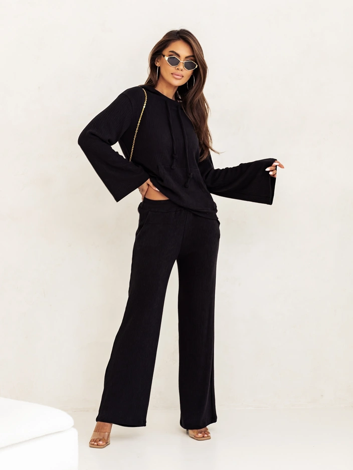 - Жіночий светровий комплект, виготовлений з приємної тканини. Светр одягається через голову, має довгі рукави та капюшон. Широкі штани з 2 вставними кишенями та еластичним поясом. Ідеально підходить для тих, хто цінує комфорт.