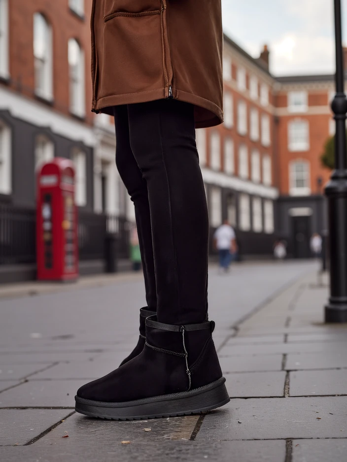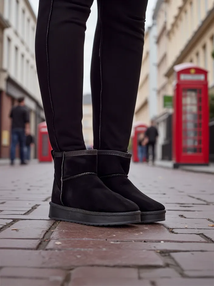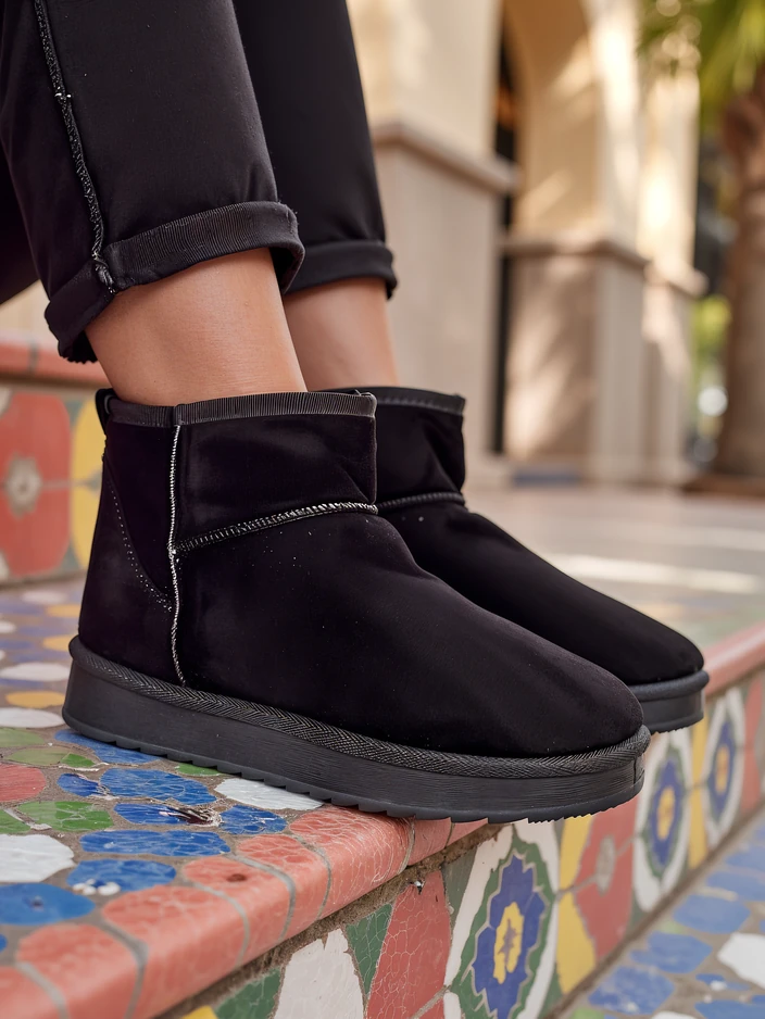- Чудові жіночі зимові снігові чоботи з плоскою підошвою. Верх виготовлений з еко-свиди, внутрішня частина обшита хутром. Ідеальна основа для зими!