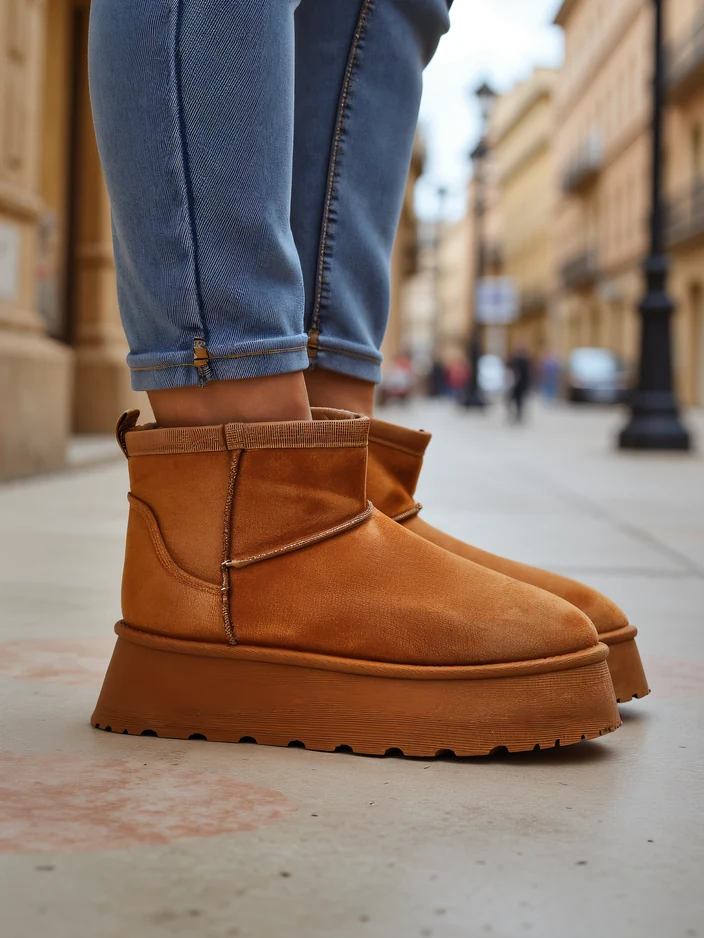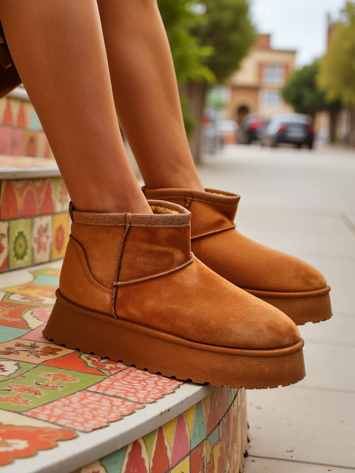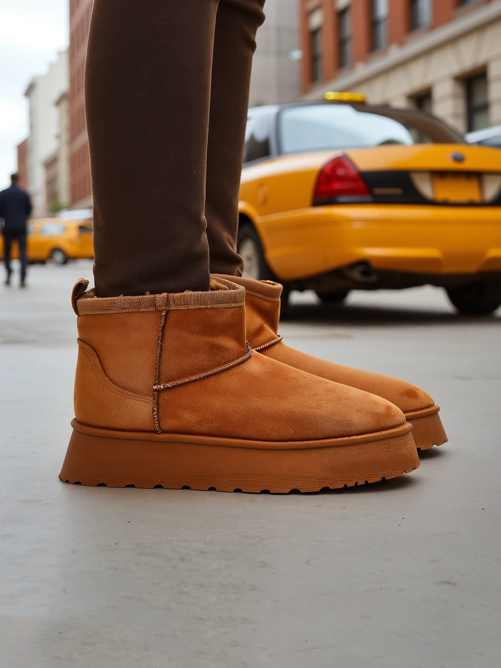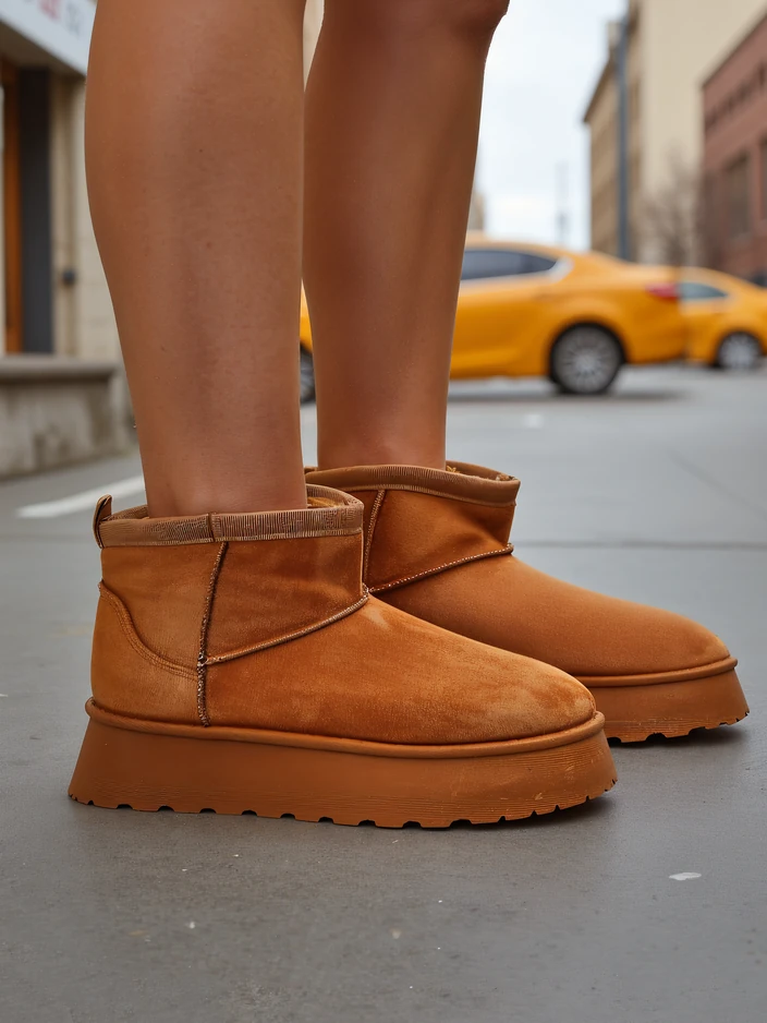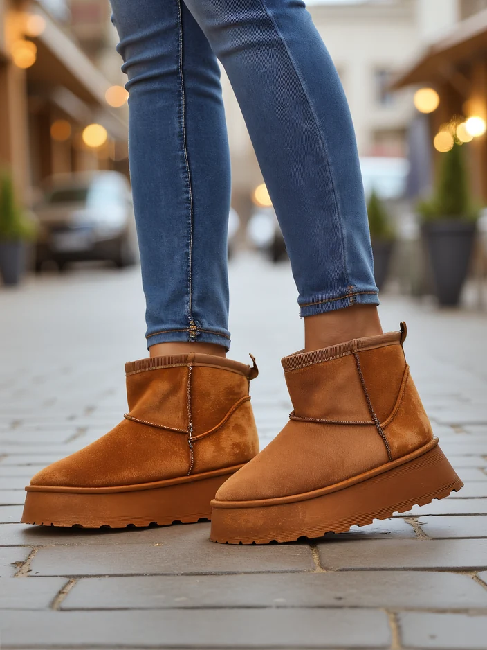 - Чудові зимові чоботи для жінок у стилі снігових чобіт на платформі. Верх виконаний з штучної замшевої шкіри, а внутрішня частина утеплена хутром. Ідеальна база для зими!