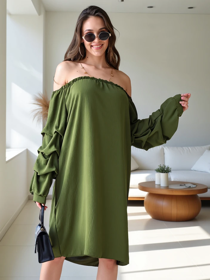 - Фантастична сукня в іспанському стилі, виготовлена з легкої, струменевої тканини. Сукня до коліна з довгими рукавами, прикрашена рюшами та еластичним вирізом по горловині, підкреслюючи силует. Сповнена чарівності та легкості!