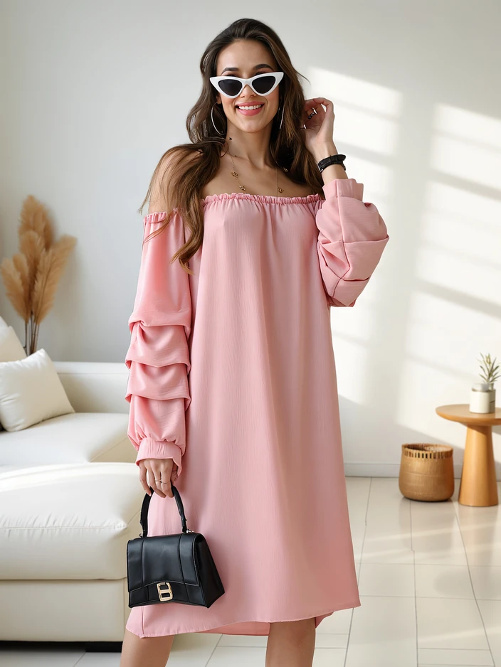 • Фантастична сукня в іспанському стилі, виготовлена з легкої, струменевої тканини. Сукня до коліна з довгими рукавами, прикрашена рюшами та еластичним вирізом по горловині, підкреслюючи силует. Сповнена чарівності та легкості!