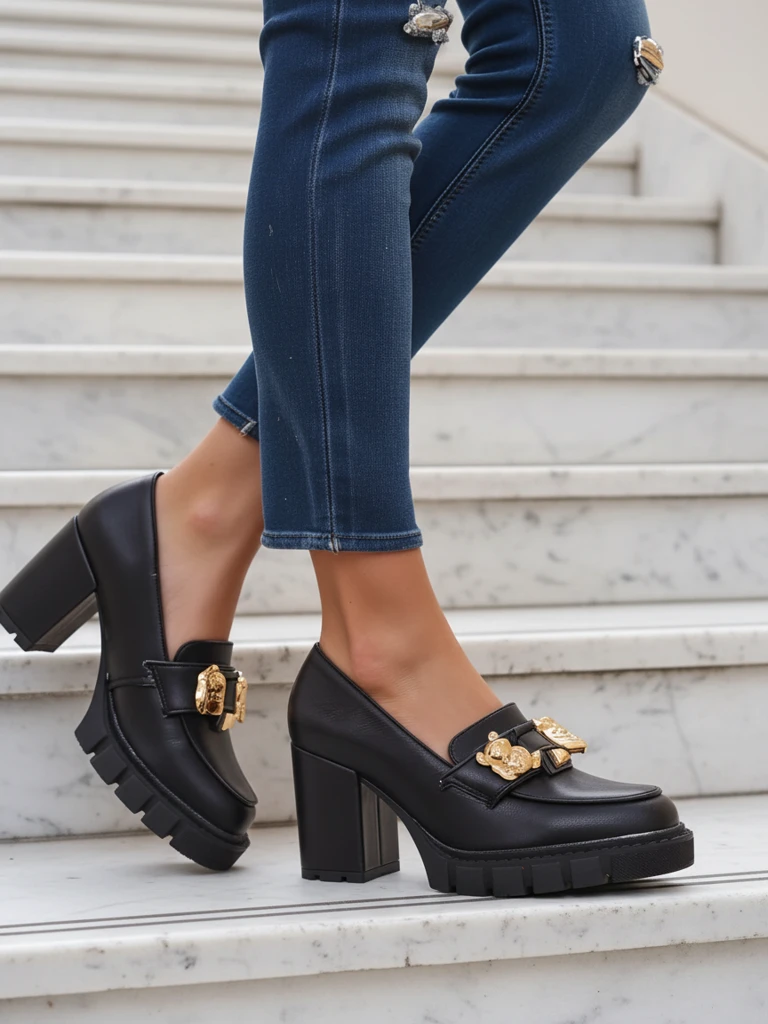 - Класичні жіночі мокасини на підборах. Модель повністю виготовлена з екошкіри. Взуття має витончену прикрасу на халяві. Ідеальна база на кожен день!