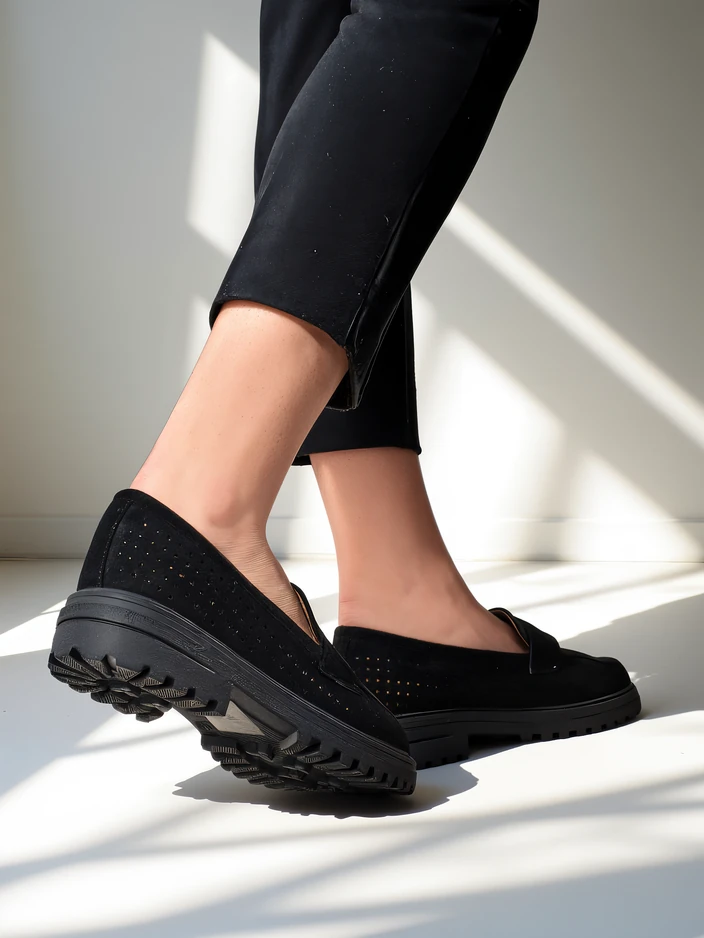 • Перфоровані жіночі мокасини на плоскому каблуці. Модель виготовлена з екологічно чистої замшевої шкіри з начинкою з еко-шкіри. Ідеальне доповнення до повсякденних образів!