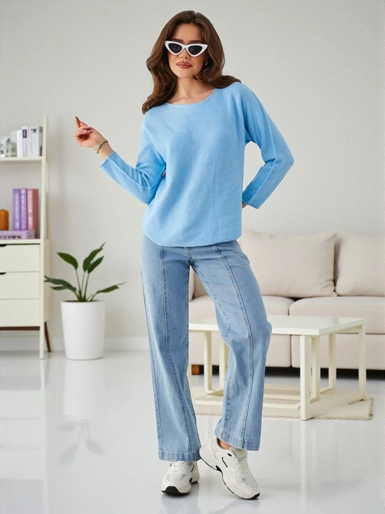 - Damski sweterek wykonany z lekkiej, wiskozowej tkaniny. Posiada długie rękawy i okrągły dekolt, zapewniając komfort i elegancję w codziennych stylizacjach. Dostępny w różnych kolorach, pozwala na łatwe dopasowanie do każdej garderoby!