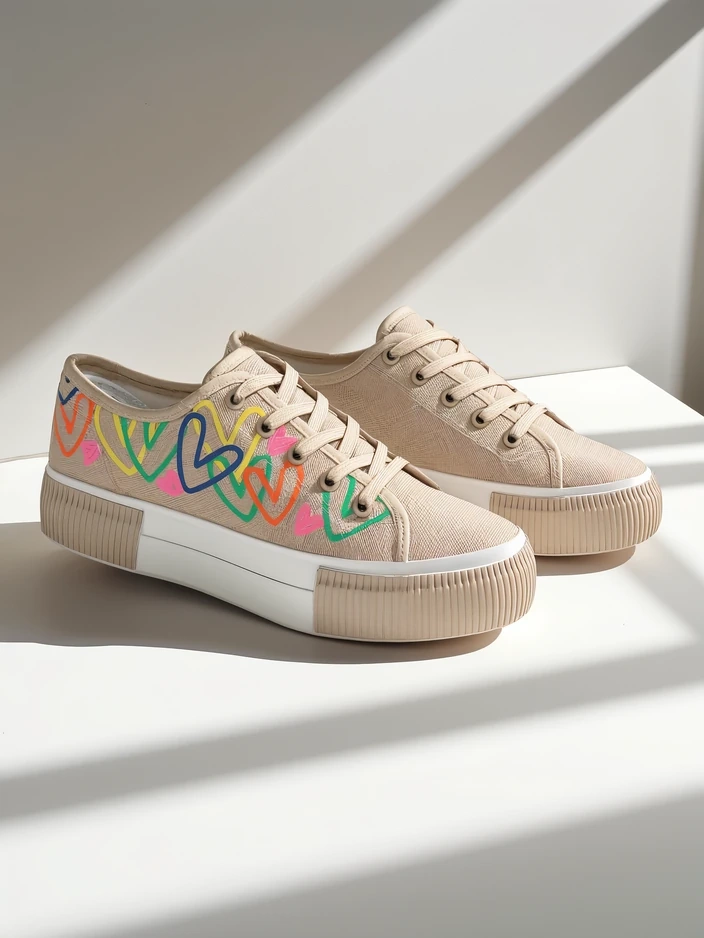 - жіночі кросівки, виготовлені з текстильного матеріалу. Верх — шнурівка, прикрашена принтом сердечок. Підошва — класична гумова. Ці черевики будуть відмінними для щоденного носіння!