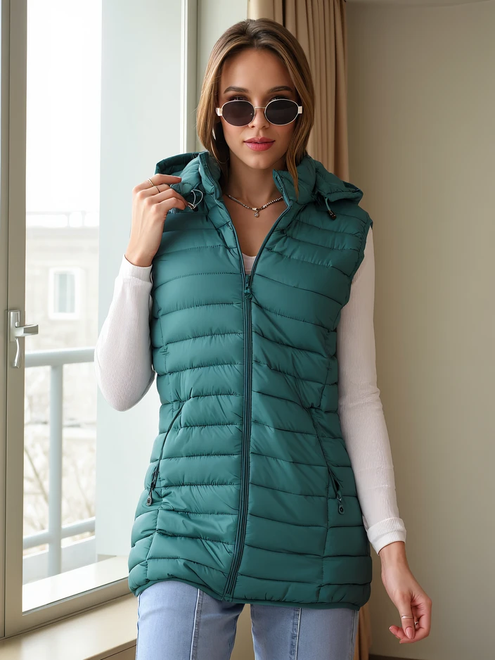 - Стильна жіноча безрукавка на блискавці, з двома практичними кишенями та відстібним капюшоном. Ідеальна посадка, м'яка синтетична підкладка гарантує комфорт і тепло в прохолодні дні.