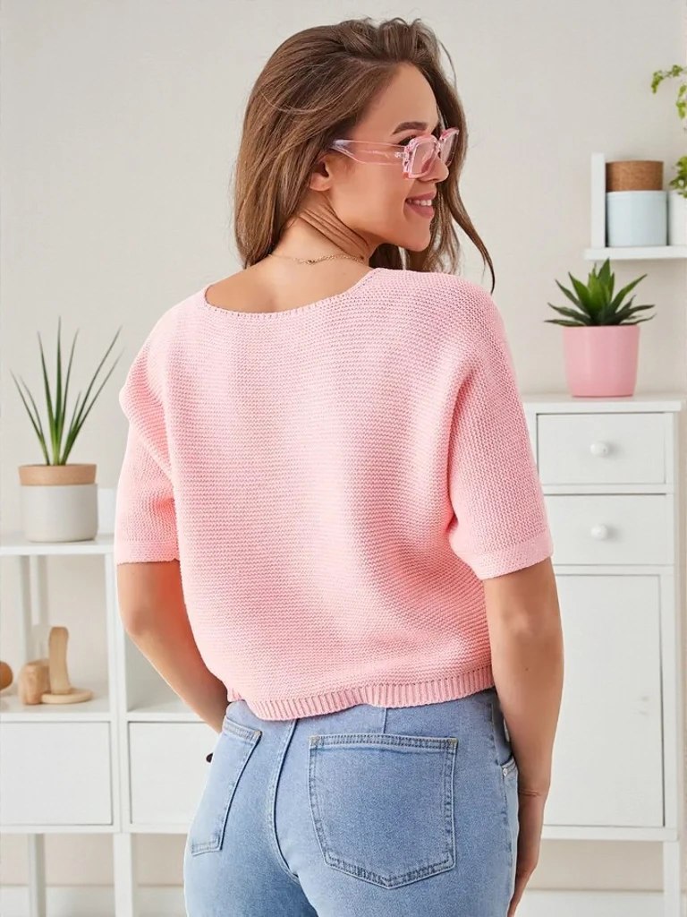 • Модний жіночий светр з м'якої тканини, який забезпечує комфорт під час носіння. Модель має V-подібний виріз і короткі рукави. Додатково прикрашена тонким квітковим візерунком, що додає шарму та жіночності.