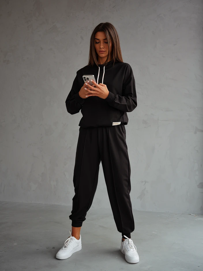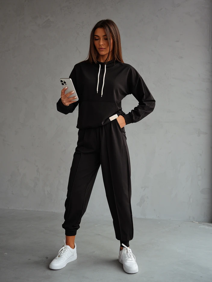 • Жіночий спортивний комплект, виготовлений з приємної тканини. Світшот на голову, з довгими рукавами і кишенею. Звужені штани з 2 боковими кишенями і еластичним поясом. Ідеально для тих, хто цінує комфорт.