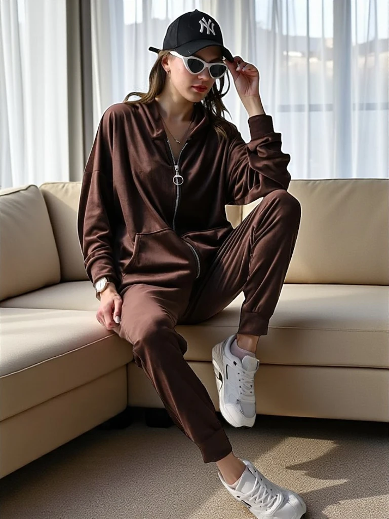- Жіночий комплект а-ля оксамит, виготовлений з приємного матеріалу. Світшот на блискавці з капюшоном. Довгі штани з еластичною талією, 2 кишені. Відчуйте стиль у цьому чудовому комплекті!