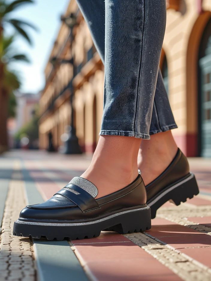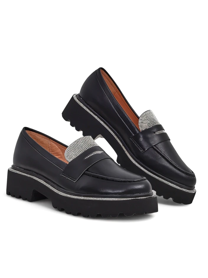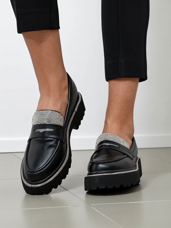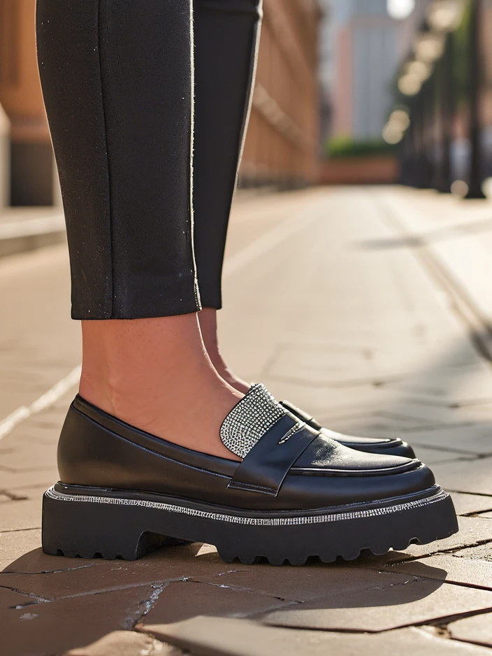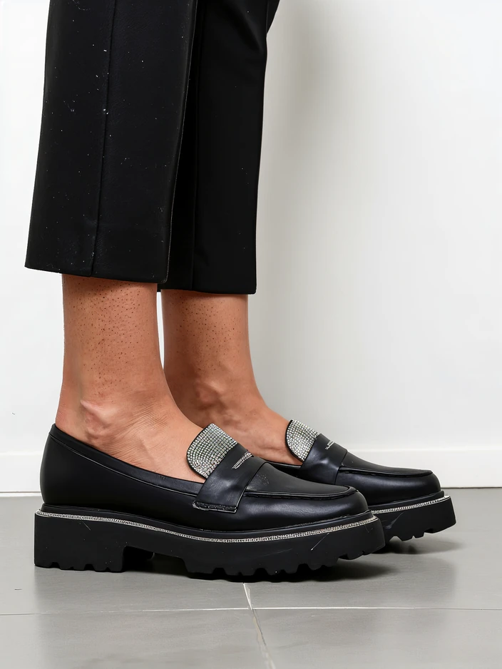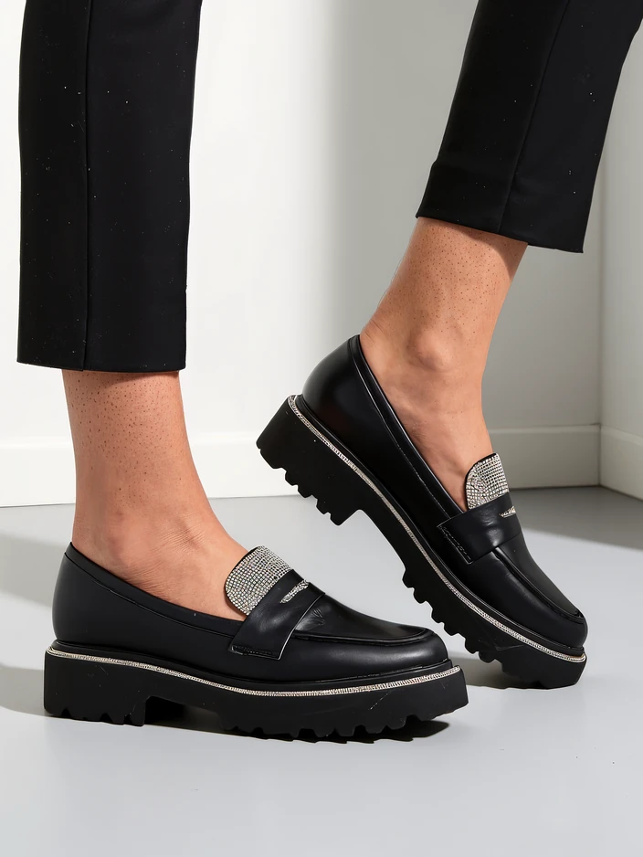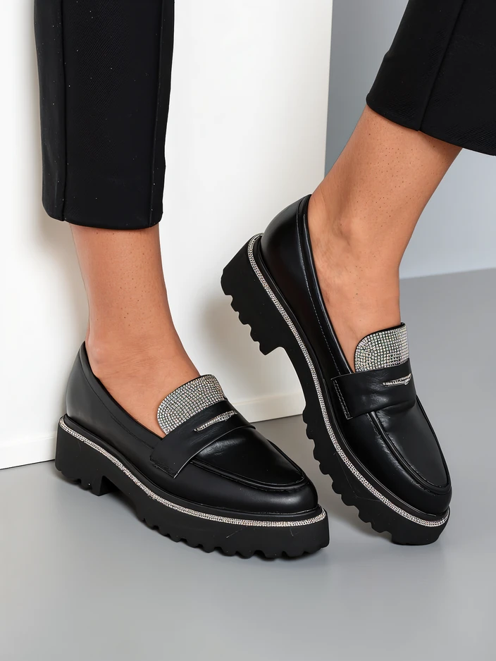 - Виключні жіночі мокасини на плоскій підошві. Класична модель з екологічної шкіри та устілка з екологічної шкіри. Підошва прикрашена стрічкою з страз. Ідеальна базова модель для повсякденного носіння!