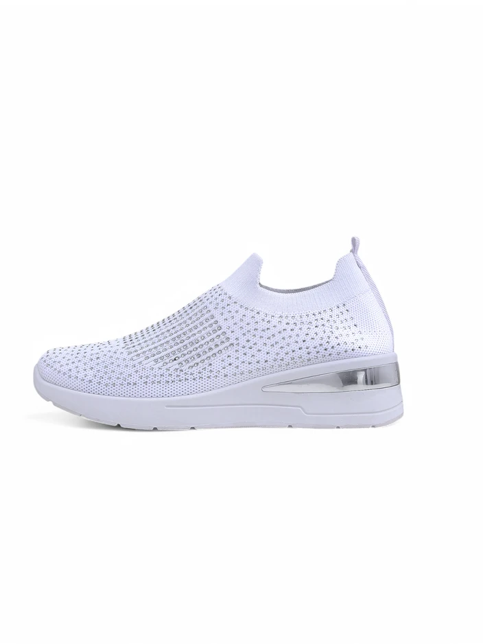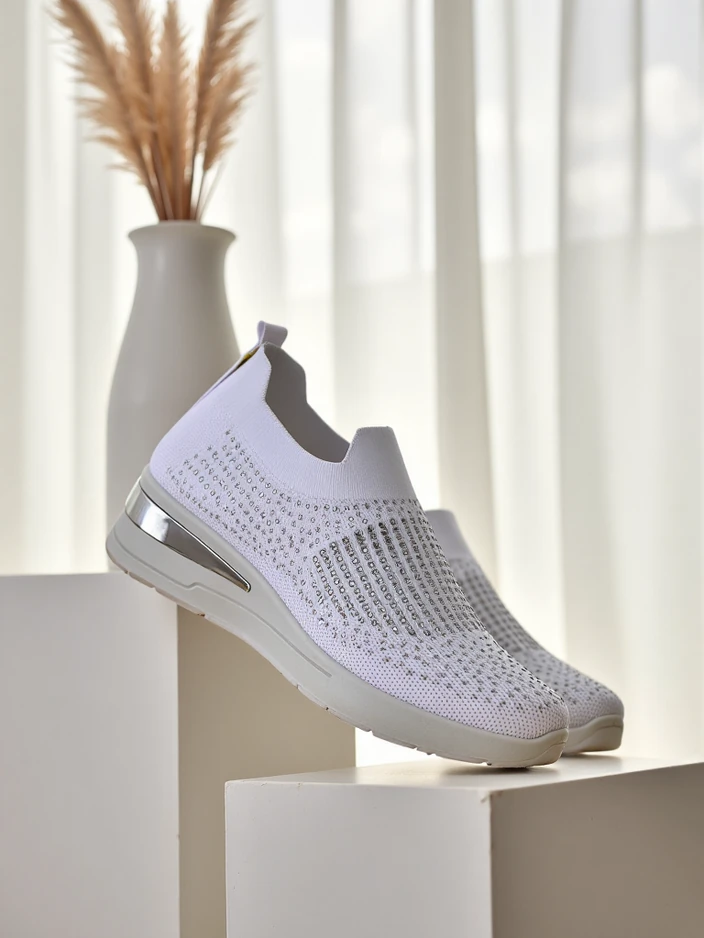 - Модні жіночі wedge кросівки з тканини, прикрашені стразами. Має м'яку текстильну устілку. Взуття без застібки. Вони стануть чудовим доповненням для повсякденних образів.