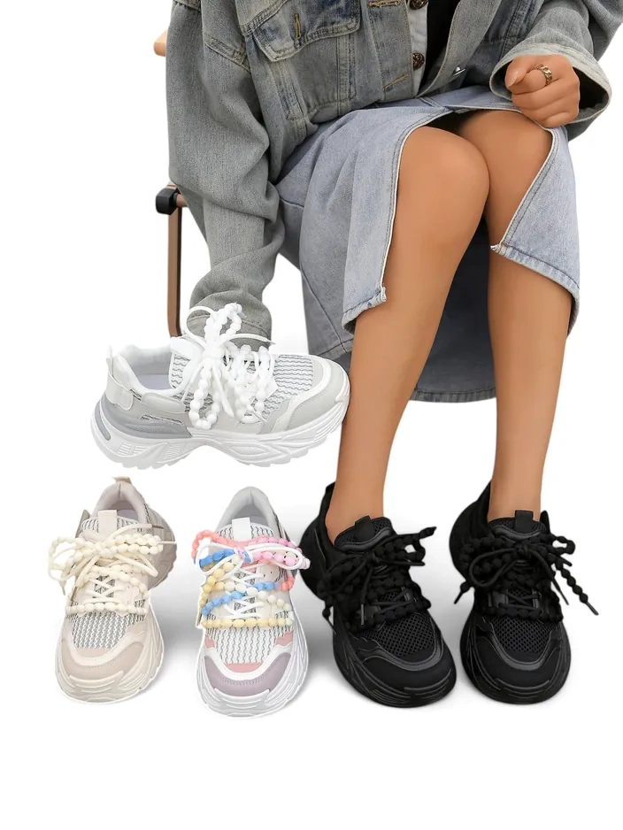• Оригінальні жіночі кросівки на товстій підошві - ідеальне поєднання стилю та комфорту. Взуття виготовлене з еко-шкіри. Модель на шнурівці, має текстильну підкладку. Ідеально підходить для активних людей!