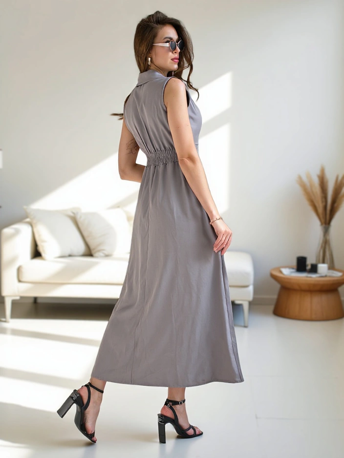 - Жіноча безрукавна сукня з обгорткою у зоні шиї. Модель має еластичний пояс і пливучий низ. Бізнесова елегантність! ЗАУВАЖЕННЯ: Точність вимірювання (+/-) 1 см.