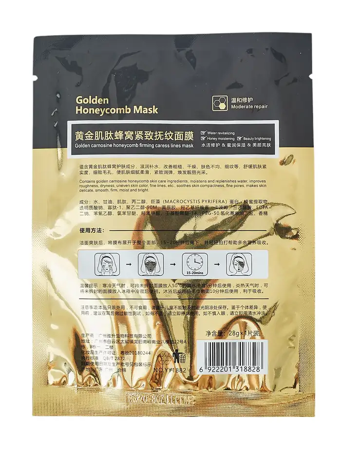 - Золота маска у формі листа з медовою структурою зволожує, живить і регенерує шкіру, залишаючи її гладкою, сяючою та наповненою світлом.