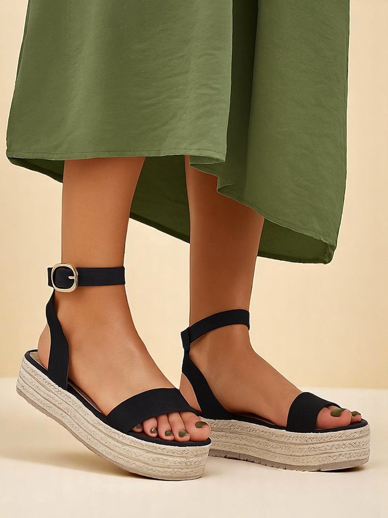 - жіночі платформні сандалі. Сандалі виготовлені з еко-самту і мають еко-шкіряну устілку. Взуття оснащене застібкою на пряжку і має декоративну підошву з джутового каната. Ідеально підходять для створення модних літніх образів!