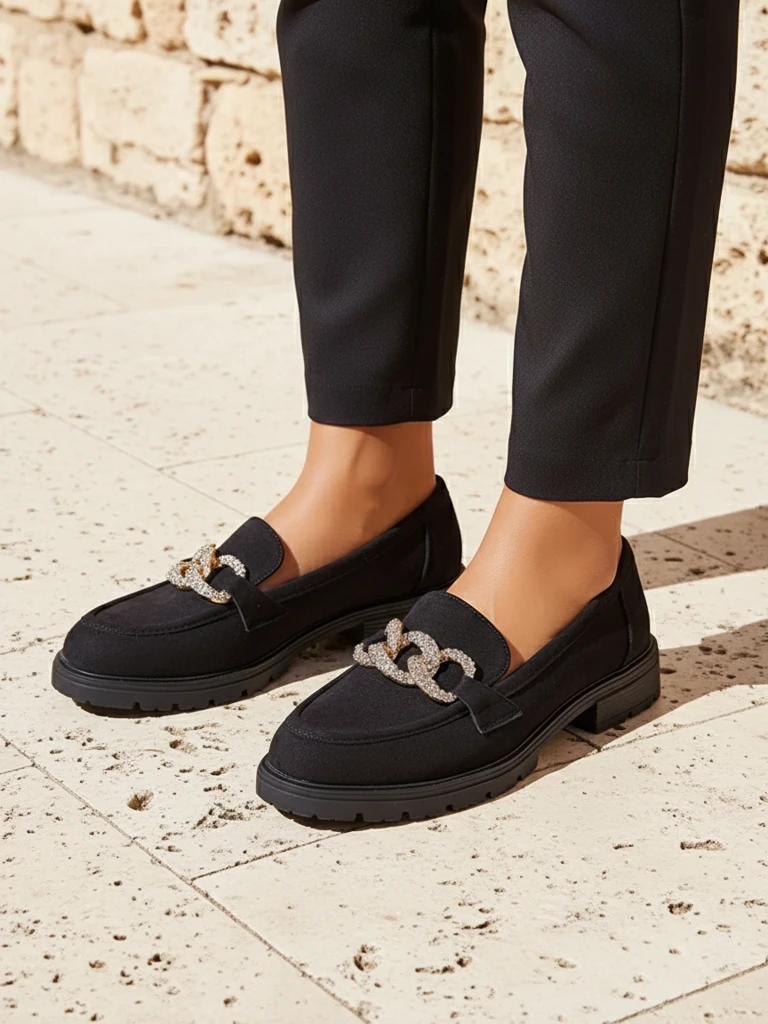 - Класичні жіночі мокасини з товстою підошвою. Класична модель з екологічної замшевої шкіри та устілкою з екологічної шкіри. Взуття має елегантне декорування на верхній частині. Ідеальна основа для щоденного носіння!