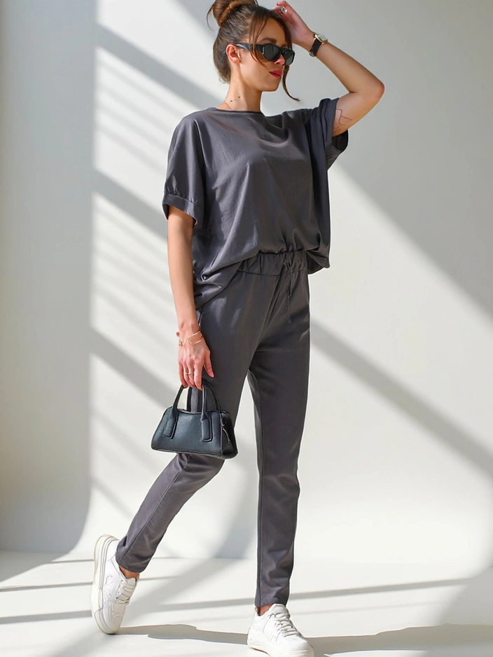 - Жіночий повсякденний комплект, виготовлений з приємної тканини. Блуза тягнеться через голову, має короткі рукави та круглий виріз. Прямі штани з еластичним поясом. Ідеально підходить для тих, хто цінує комфорт.