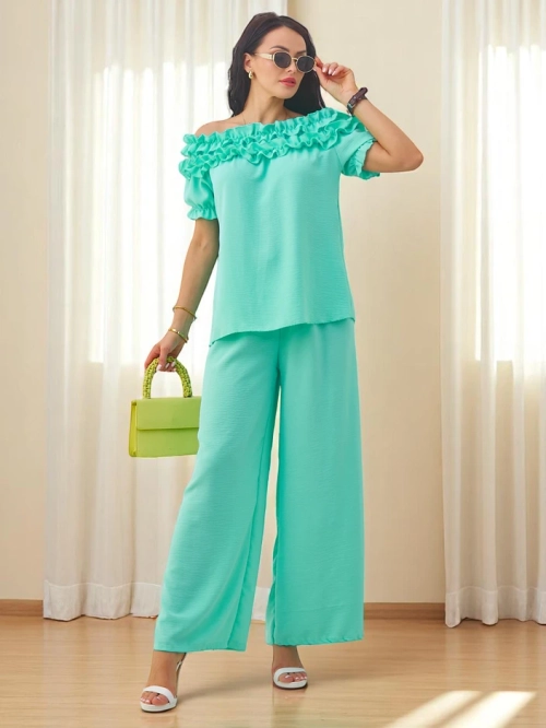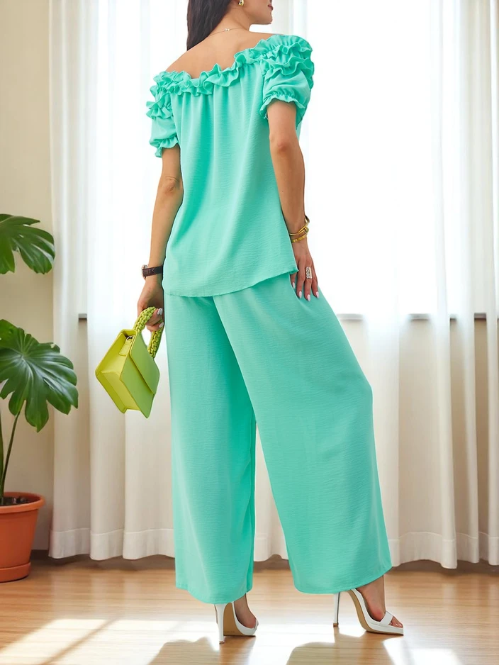 - Жіночий комплект з блузою з відкритими плечима з короткими рукавами та декоративним вирізом, а також з розкльошеними штанами, є елегантним і жіночним варіантом для теплих днів. Легкий, зручний дизайн забезпечує свободу рухів та стильний вигляд.