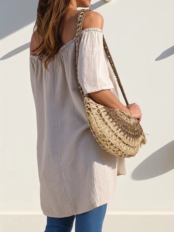 - Елегантна жіноча блузка з бавовни в іспанському стилі з тонкими декоративними ґудзиками. Ідеальна для теплого часу року, вона поєднує комфорт з жіночним, романтичним стилем.