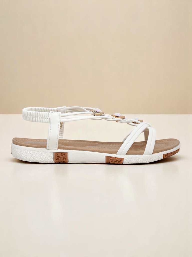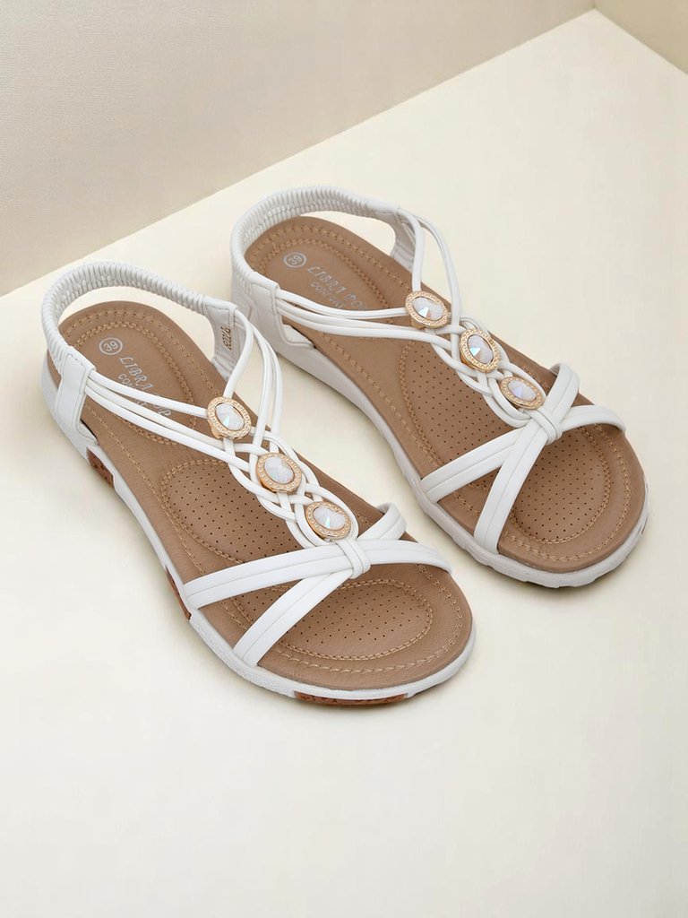 - Жіночі сандалі на плоскій підошві - це ідеальний варіант для спекотних літніх днів. Ремінці виготовлені з приємної екологічної шкіри. Передня частина прикрашена елегантними плетеними ремінцями та прикрасами з цирконію. Взуття без застібок.