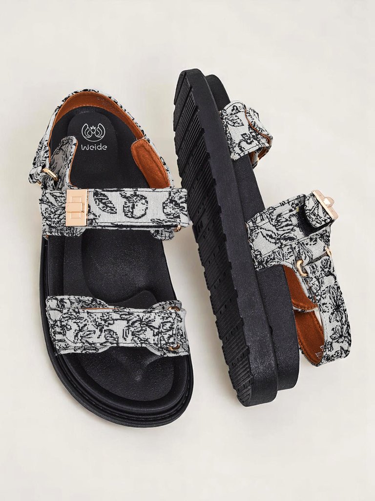 • Жіночі сандалі на плоскій підошві — ідеальний варіант для спекотних літніх днів. Ремінці виготовлені з приємної тканини, а устілка — зі штучної шкіри. Взуття застібається на липучку. Найкраще для щоденного носіння!
