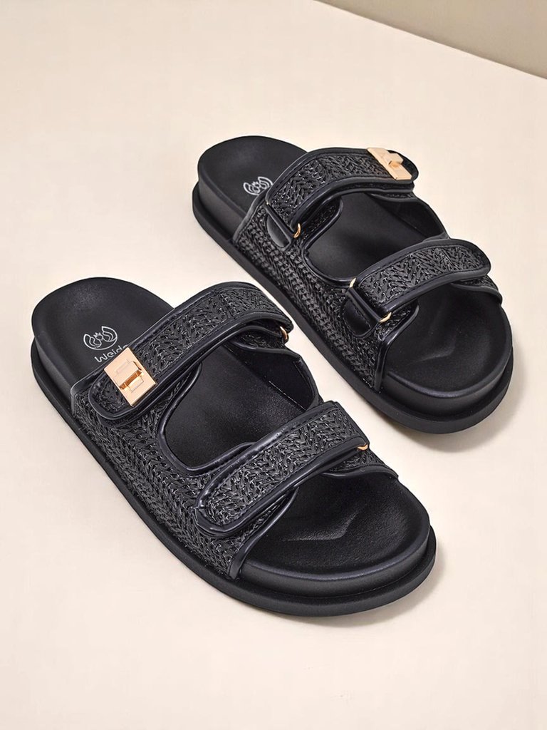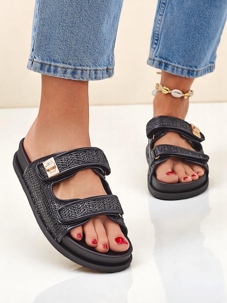 • Красиві жіночі шльопанці з солом'яної тканини, прикрашені пластиковими пряжками. Гумова підошва. Модель має регульовані ремінці на липучках. Ідеально доповнять літні образи!