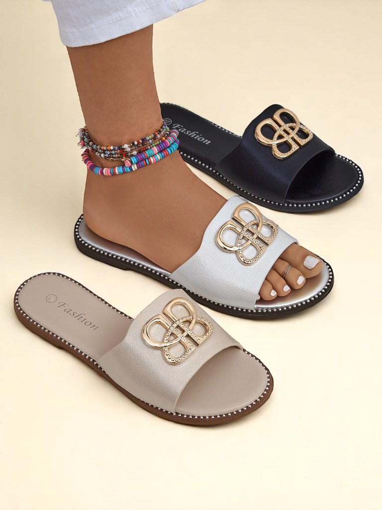 - Стильні шльопанці з екошкіри на плоскій підошві, оздоблені золотою прикрасою. Комфорт і елегантність на кожен день, які додадуть блиску будь-якій літній стилізації.