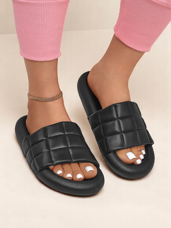 - Стильні жіночі шльопанці з екошкіри зі стьобаним верхом і гумовою підошвою. Зручні, легкі та модні — ідеальні на літо, для прогулянок і повсякденних, невимушених образів.