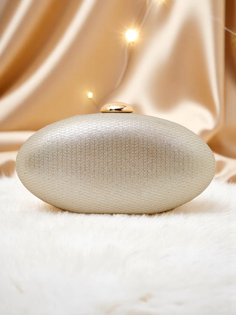 - Сумка-конверт овальної форми, виготовлена зі штучної шкіри, вкрита тканиною з блискучою ниткою та тисненням. Застібається на кнопку, з відстібним ланцюжком – стиль і сяйво!