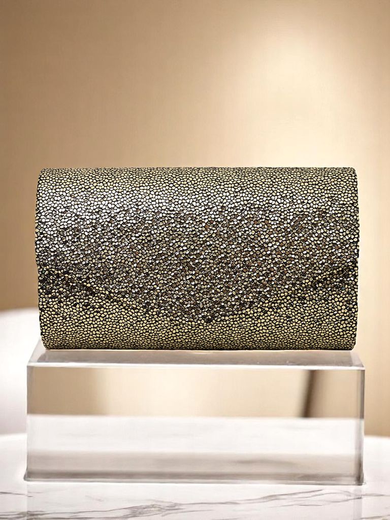 - Блискучий клатч, виготовлений з екокожі, покритий щільним глітером. Застібається на магніт, знімний ремінець — ідеальний вибір для вечора, сповненого гламуру та стилю.