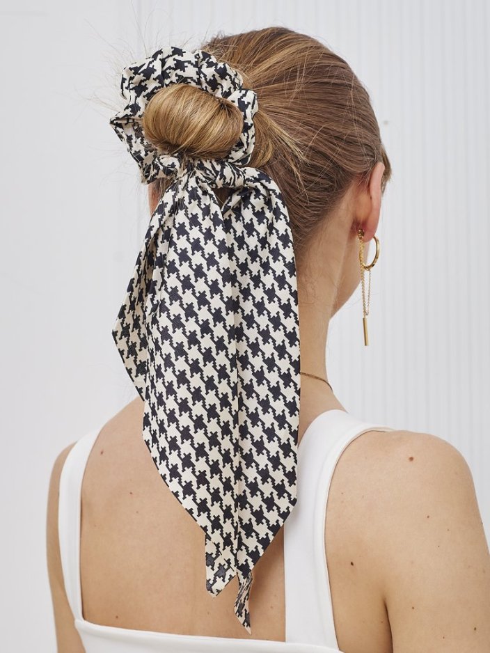 • Резинка для волосся з довгою стрічкою в класичний картатий візерунок. Стильний і практичний аксесуар, який оживить будь-яку зачіску, додавши їй характеру та модний, позачасовий малюнок.