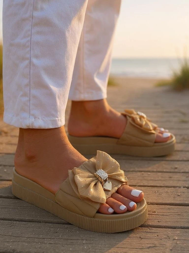 Florensis Bella – це елегантні жіночі шльопанці на платформі, які вирізняються ніжною кремовою кольоровою гамою та великим декоративним бантом з блискучою аплікацією. Верх виготовлений з високоякісного текстильного матеріалу, який злегка блищить і є оксамитовим на дотик, а устілка та підошва – з міцного матеріалу EVA, що гарантує комфорт і легкість під час носіння. Цей матеріал є антиковзким, стійким до вологи та легко чиститься, що підтверджено численними сертифікатами безпеки, чинними для повсякденного взуття. Головні переваги продукту – це підвищена, рифлена підошва, яка візуально подовжує ноги, і м’яка устілка, що забезпечує комфорт протягом усього дня. Великий декоративний бант розміщений на широкому ремінці, що стабілізує стопу і водночас додає елегантності – елемент біжутерії з кристаликами та сердечком привертає увагу та підкреслює жіночий характер шльопанців. Ці шльопанці чудово підійдуть для трьох різних стилізацій: 1. Романтичний образ на побачення: поєднайте з пастельною сукнею максі або розкльошеною спідницею та легкою блузкою. 2. Міський стиль: підберіть до коротких денімових шортів і білої оверсайз футболки. 3. Casual на пляж: поєднайте з легкими штанами типу палаццо та топом на бретельках. Florensis Bella відповідає актуальним трендам «girly chic» і «pastel soft», які домінують цього літа. Їхня тонка елегантність і оригінальний декор з аплікацією роблять кожен образ особливим – навіть найбільш мінімалістичний. Чистити шльопанці швидко та просто: достатньо вологої ганчірки з м’яким миючим засобом. Не сушіть безпосередньо на сонці або біля обігрівачів – рекомендовано сушити в тіні, при кімнатній температурі. Зберігати в сухому місці, подалі від гострих предметів, щоб не пошкодити текстильний матеріал і прикраси. Florensis Bella – це поєднання комфорту, стилю та актуальних модних тенденцій – незамінний вибір для літніх днів, прогулянок, екскурсій чи зустрічей з друзями.