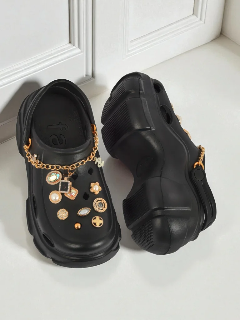 Aurelia Nero – це унікальні кламки, які поєднують в собі інноваційність і стиль. Виготовлені з високоякісного матеріалу EVA, який славиться своєю легкістю, пружністю та стійкістю до деформацій. Матеріал безпечний для шкіри, не викликає натирань і легко чиститься, що робить ці кламки ідеальними для щоденного використання – як вдома, так і на вулиці. У моделі застосовано передову технологію формування цільної конструкції, що забезпечує виняткову міцність та ергономічне прилягання до стопи. Прикраси у вигляді біжутерних шпильок, перлин та золотого ланцюжка надають кламкам виняткового, розкішного характеру. Ці деталі натхненні італійською та грецькою класикою, завдяки чому модель Aurelia Nero відповідає актуальним модним тенденціям сезону. Виразна форма та чорний колір з тонкими золотими акцентами пасуватимуть до різних стилізацій. Переваги використання: - Високий комфорт ходьби завдяки м'якій підошві, що амортизує - Прикраси, що підкреслюють індивідуальний стиль - Легкість і надзвичайна міцність матеріалу EVA - Антиковзка підошва, що забезпечує безпеку Ідеї для стилізацій: 1. Casual chic – поєднайте з широкими штанами, білою футболкою та джинсовою курткою для міського луку. 2. Спортивний комфорт – поєднайте з легінсами та кроп-топом під час виходу на покупки або прогулянку. 3. Літня елегантність – комбінуйте з лляною сукнею міді та золотими прикрасами для луку на літній бранч чи зустріч з друзями. Догляд та консервація: Кламки Aurelia Nero дуже легко підтримувати в чистоті – достатньо протерти їх вологою ганчіркою або обполоснути під проточною водою. Уникайте впливу прямих джерел тепла. Зберігайте в сухому місці, щоб зберегти первинну форму та колір. Тренди: Кламки з біжутерними прикрасами та масивною підошвою – хіт цього сезону. Вони поєднують зручність з модою, дозволяючи створити виразну стилізацію як на кожен день, так і на особливі випадки. Модель Aurelia Nero підкреслює індивідуальність, ідеально вписуючись в естетику стрітвіру з елегантним твістом.