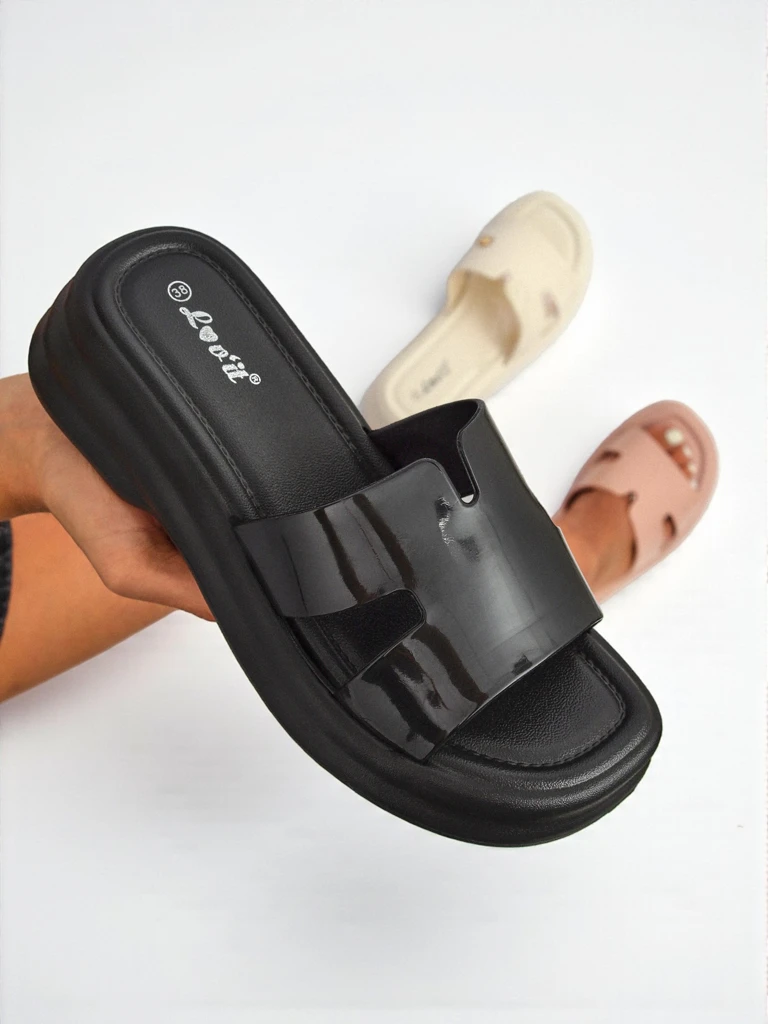 - Жіночі шльопанці на товстій підошві, з устілкою з екологічної шкіри та ремінцем з лакованої гуми. Сучасний стиль і комфорт в одному – ідеальні для літніх, міських стилізацій.