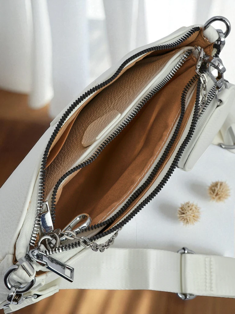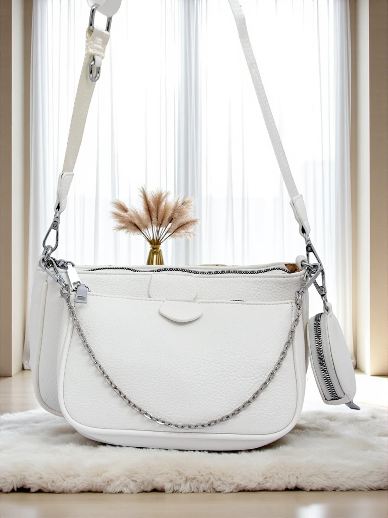 - Стильна, маленька сумочка з екошкіри з подвійною камерою на блискавці. У комплекті знімний регульований ремінець, відповідна косметичка та гаманець – ідеально підходить для повсякденного використання та особливих випадків.