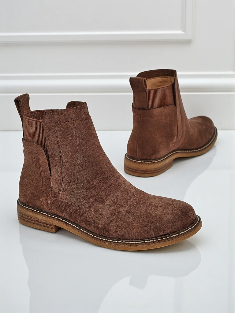 - Красиві та класичні ботильйони a'la челсі на плоскій підошві, виготовлені з екологічної замшевої шкіри. Усередині утеплені хутром. Чудова база для осінніх стилізацій!