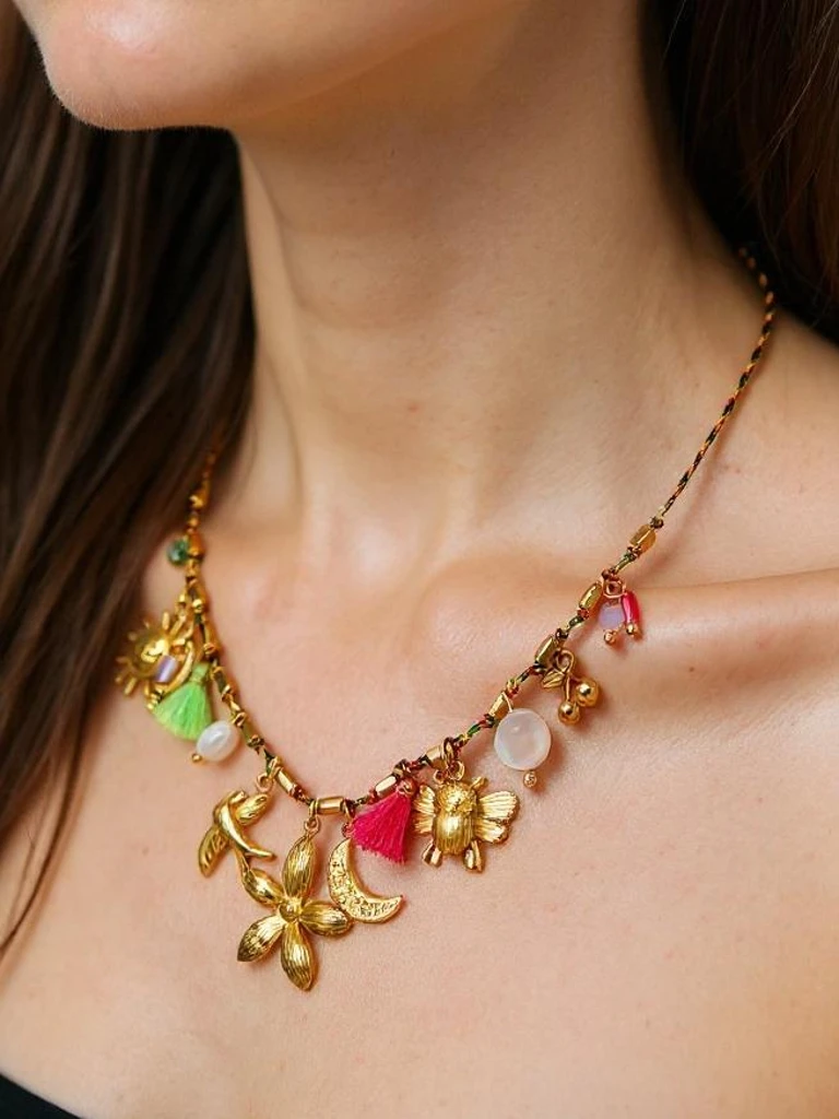• Намисто Aurora Floralis з шармами та перлами – це унікальна біжутерія в стилі бохо, ідеальна для будь-якої нагоди.