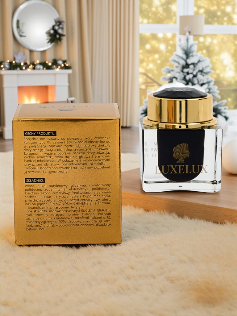 - Розкішний антивіковий крем Luxelux з колагеном типу III інтенсивно регенерує та зміцнює шкіру. Завдяки поєднанню інноваційних технологій та азіатських інгредієнтів забезпечує гладкість, еластичність та молодший вигляд. Ідеально підходить для денного та ні