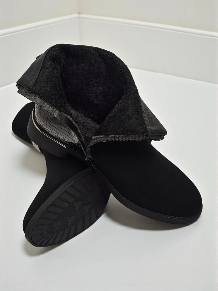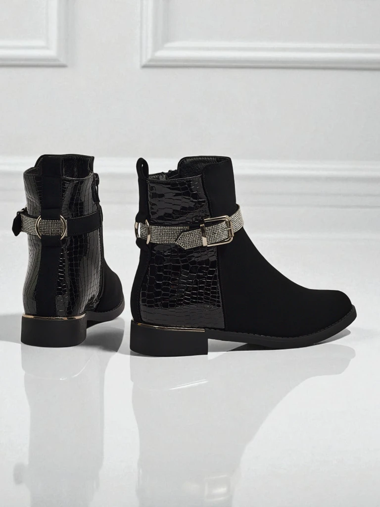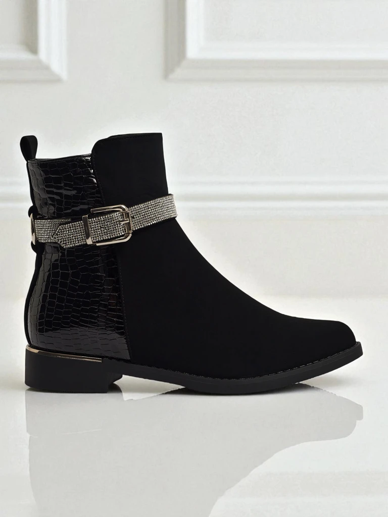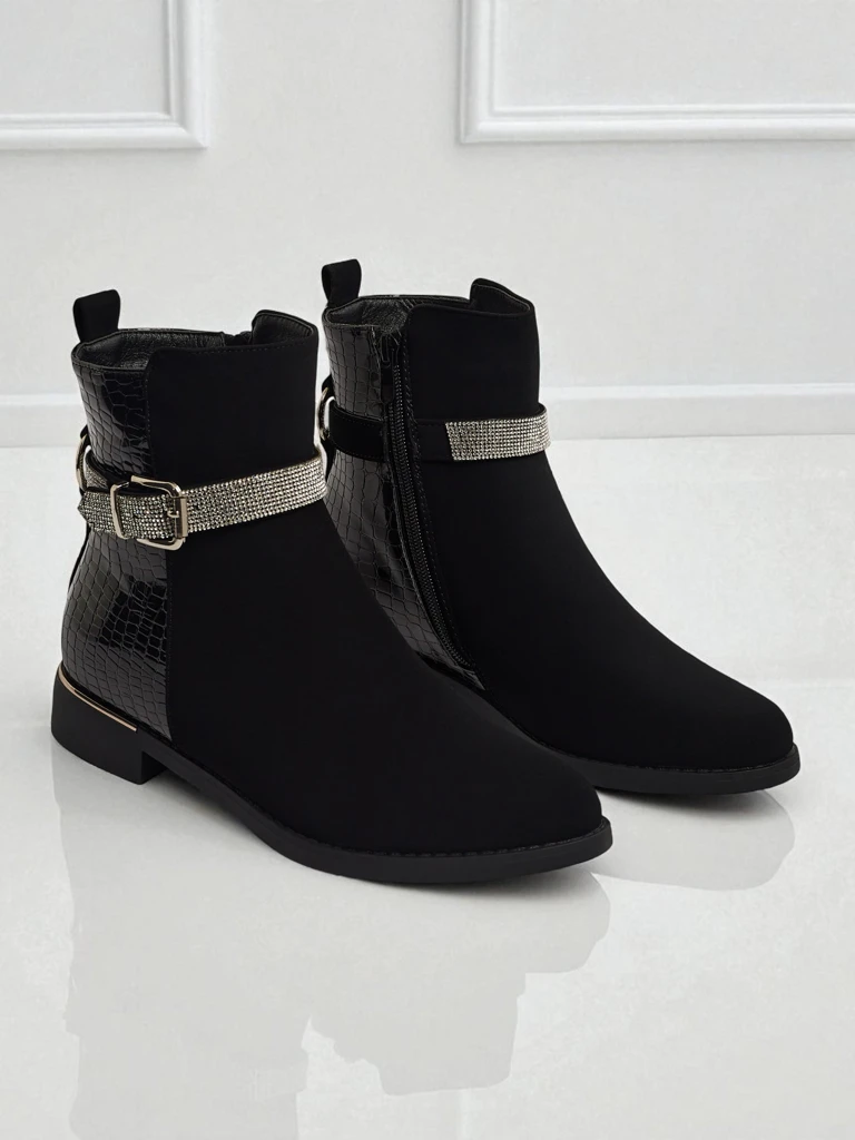 - Жіночі ботильйони на блискавці. Модель виготовлена з комбінації матової та лакованої екологічної шкіри, на плоскій підошві. Мають утеплення а-ля хутро. Прикрашені цирконами. Зручні та стильні, ідеальні на осінь!